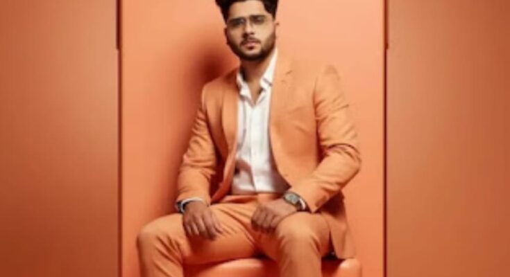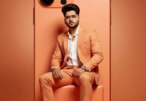 Create a studio portrait of the same person and make sure the face matches the model exactly in the photo. He is wearing a light orange blazer and light orange slim-fit trousers with white sneakers, and a white shirt slightly unbuttoned. He is seated on a big iPhone 17 Pro Max, 100% same model cosmic orange color, with a gradient light orange background and spotlight lighting, in the style of a fashion photoshoot