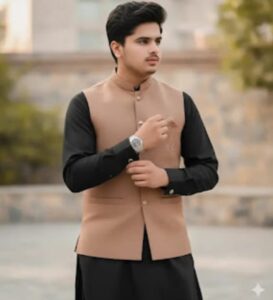 the exact same face from the reference image, no changes or alterations. I wear a tailored Black Shalwar Kameez with a light brown waistcoat,