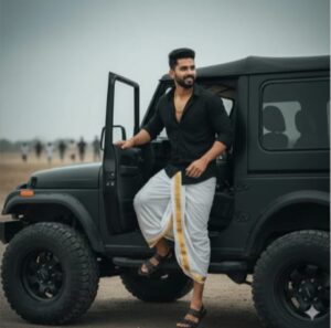 “A stylish young man with a short beard and mustache, wearing a black long-sleeved shirt unbuttoned at the collar, a gold chain, a traditional white dhoti with a gold border, and dark sandals, is stepping out of a black off-road jeep with large tires. The driver’s side door is open, and he is looking slightly to his right with a confident expression. In the blurred background, there’s a group of people running in the distance under an overcast sky. The scene has a rugged, adventurous yet fashionable vibe, with a focus on the man and the jeep.”